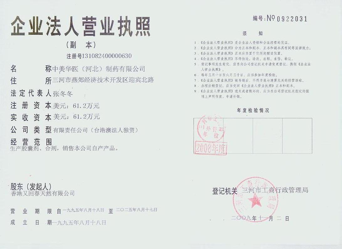 企 業(yè) 簡 介 中美華醫(yī)制藥有限公司是中美集團(tuán)為實(shí)現(xiàn)多元化的戰(zhàn)略發(fā)展規(guī)劃,在北京東燕郊經(jīng)濟(jì)技術(shù)開發(fā)區(qū)投資興建的現(xiàn)代化大型藥品生產(chǎn)企業(yè)。公司占地100畝,總投入8000萬元,于2004年6月8日通過投產(chǎn)前驗(yàn)收,2004年8月18日通過了國家GMP認(rèn)證。 經(jīng)過不斷的探索和努力,企業(yè)步入了一個(gè)良性循環(huán)的發(fā)展軌道。至今,公司具有年可生產(chǎn)硬膠囊8億粒,口服液1億支,片劑3億片,顆粒劑500萬袋,提取處理... |